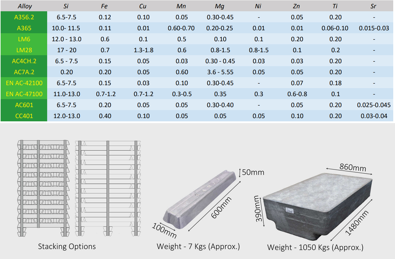 The metal is degassed using an in-line launder treatment process and thoroughly analyzed before, during, and after casting. Final cast products include 7 kg ingots and sows in varying weights.